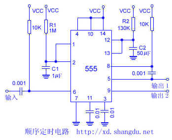 通过0.001μF耦合电容把556双定时器的前半部分输出送到后半部分输入,给出等于单个延迟之和的总延迟。将脚6瞬间接地可以启动定时器的前半部分。由1.1R1C1确定的时间间隔后,第二个定时器开始延时,其值决定于1.1R2C2。