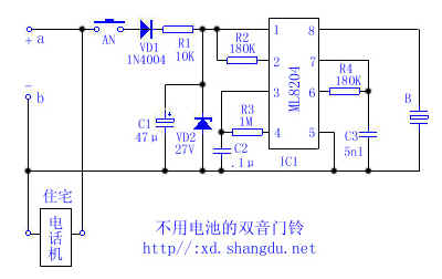 随着电话机的普及率越来越高,拥有住宅电话的家庭也越来越多,但大多数住宅电话使用率很低,利用电话入户馈线提供的48V(60V)直流馈电作电子门铃的工作能源是经济实用的。现介绍一款不用电池的双音门铃电路。电路原理如图所示,不难看出,图中电路是常规的电话机振铃电路的变型。a、b分别是电话机入户线的正、负两端。AN为常开型门铃按钮,在电话机候机时,按下AN,程控交换机提供的48V(或60V)电压,直流馈电经VD1、R1对电容C1充电,当C1端电压Vc达到IC1的起控电压时,IC1起振送出双音电子铃流使蜂鸣器B发声,告知主人有客来访。而当电话机正在使用时,则图中a、b之间的电压较低达不到IC1的起控电压,此时,即使按下AN门铃按钮也不工作,这是因为由于R1取值较大,远大于电话机的阻抗。故AN按下时对电话机的正常通话无影响。也对程控交换机无不良影响,仅在使用门铃时对其间打入的电话遇忙。