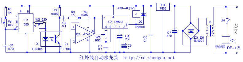 调试:D1和BG要用铁皮罩起来,调W1、W3可使红外线发射、接收频率一致,使人体接近水龙头时,电磁阀能够可靠动作;调节W2阻值,可以改变D1的发射电流,从而控制电路在人体接近时的有效作用距离(即灵敏度)。