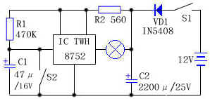 电路中的IC为大功率开关集成电路TWH8752,最大允许通过电流为4A,H为后刹车灯,R1为470K,C1选用16V、47μF电解电容器,C2选用25V、2200μF电解电容器,VD1选用1N5408型整流二极管。如需改变延时时间,可适当改变R1、C1的值。