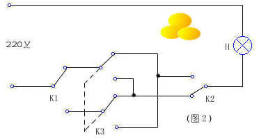 K1、K2是单刀双投开关,K3是双刀双投开关。在这个电路中,扳动三个开关中的任何一个,电灯的亮灭状态都要变化。根据需要,可在K1和K2之间增加几个双投开关,就能连成多个开关控制一盏灯的电路。