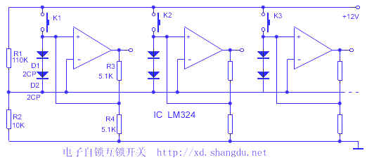 接通电源,R1、R2分压,为各运放反相端提供高电位,使各运放输出低电位。接通任一键,对应运放的同相端获得高电位,高于反相端1.4V(二极管压降),输出变为高断开关按键。因有R3、R4分压的反馈,同相端电位仍高于反相端,输出端维持高电位。当另一个键接通时,电路重复上述过程,同时,通过两只二极管D1.D2使所有运放的反相端电位高于R3.R4分压形成的同相端电位,所以输出端由高变低。总之,每一次按键,只有该运放输出高位,其余的都是低,这就是开关的自锁互锁功能。