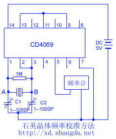 大家知道用石英晶体制成的振荡器其频率稳定性很高,然而如何确定晶体的频率或判断晶体是否合格、或从众多的晶体中挑选晶体已知频率是否合乎标称值等等确是一个难题。这里介绍一种校准石英晶体频率的方法,其校频电路简单适用,无论用来挑选晶体或检查晶体的好坏、或校频等均可使用。该校频电路由集成块CD4069组成,见下图。使用时首先校准测试电路,先将频率计接于4脚,将一枚标准晶体接于A、B两点间,再调节微调C1和C2直到频率计读数为标准晶体的频率值,此时测试电路校准完毕。然后从A、B两点取下标准晶体,接上待测晶体,此时频率计显示数即为待测晶体的标准频率值。若频率计显示为零,说明晶体是坏的;若频率计显示不稳定,说明待测晶体为不合格品。此种方法已被厂家用于检测晶体之用。