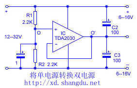TDA2030是一种高效率的运算放大器。利用它的互补输出级,可以将单极性电源一分为二,转换成某些小功率电路所需要的双极性电源。
