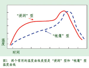 由于焊膏规范更严格的限制以及关系到在更高的过程温度下器件的损坏,为了利用无铅焊料,我们必须注意到不同的温度曲线和设备的设置。两种常见的温度曲线类型被使用在回流焊接工艺中,并且很具代表性地被称为浸润(the soak profile)和“帐篷”型(the tent profile)温度曲线(图1)。浸润温度曲线是这样一种工艺,它使得装配组件在正好低于焊料液化点以下的温度上停留一段时间,以获得一个一致的组件温度。“帐篷”型温度曲线是一个连续的温度斜坡,从组件进入回流炉开始直到达到期望的峰值温度。