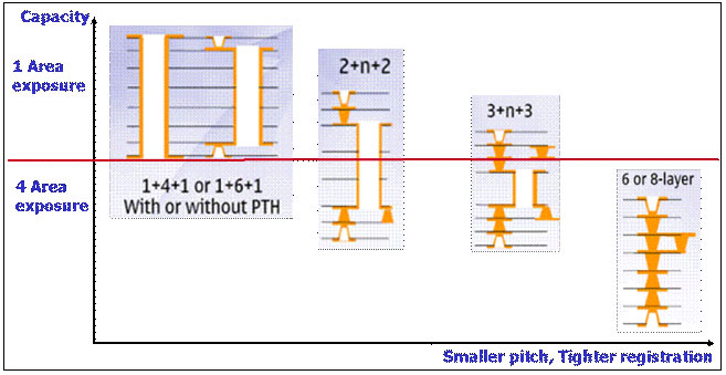 图1: HDI设计与快门曝光机可能的解决方法的对比图标 (单步骤与快门曝光机的多个步骤)