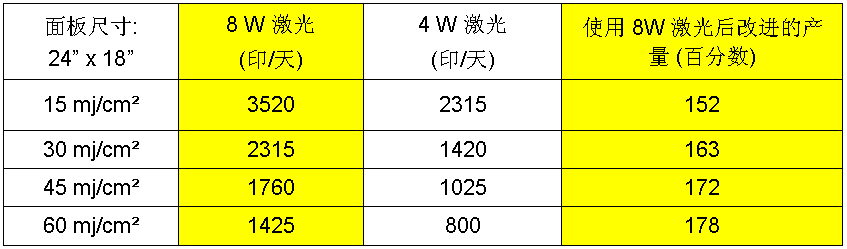 2. 产出量—电子产品最新技术发展伴随着激光电源的改进(从4W到8W)现在可以使LDI满足HDI生产的高产出量要求。激光电源的加倍是PCB生产商能够得到高成像产出量,同时又可以继续使用其传统的干膜。表1显示了一厂家用8W激光的LDI得到的日产量(22小时生产)和同厂家使用4W激光的LDI得到的产量比较,能量设置不同(15 mj/cm², 30 mj/cm², 45 mj/cm², and 60 mj/cm²),最小形体尺寸为50 µm。