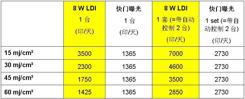 表2 8W LDI和四步骤曝光快门曝光机的日产出量比较