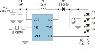 图1:Step-UP DC/DC 开关电源实现LED驱动的典型应用线路。