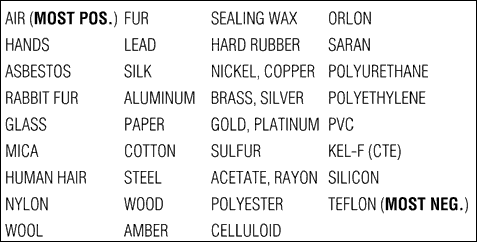 The triboelectric series (Table 1) describes this charge affinity between various materials. Charge transfer occurs when any two items on the list are brought into contact. Materials higher in the series acquire positive charge, and those lower in the series acquire negative charge.1 The net charge and resulting electrostatic voltage is greater for items farther apart on the list.