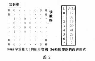 交织的目的就是将信道中突发错误的位置随机化,对于级联纠错码中使用的交织器来讲,衡量其性能的很重要的参数就是它对突发错误的扩散能力。通信系统中常用的标准交织方式一般有这样几种:一种为分组交织(矩形交织)方式。这种交织器采用R×C矩阵形式,图2(a)为码字重量为4的矩形交织示意图,按行顺序地写入数据,然后按列读出,序列的重量不会改变。作为矩阵的特殊形式T×T,正方形交织的行和列各有一个1和(T1)个0,如果1出现在第I行第j列,则交织器将输入的第I个符号移到输出的第j号位置。我们可以通过增大块交织的规模来提高系统的性能。另外一种标准交织方式是对上述矩阵形式的改进,其中,序列按照i行和j列写入,按照iT行和jT列读出,iT和jT表达式如式(1)和式(3)所示。其中,ξ的值见式(2),从图2(b)可以得到P(ξ)的值。式(1)中,