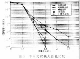 上面已经介绍了交织器有很多种形式,为了比较几种交织方式性能的优劣,我们选择了生成多项式为g=(15,17)OCTAL的RSC,选取交织器的大小均为1024的情况下,仿真出了分组交织、对角线交织、螺旋交织、PN交织、S随机交织等五种不同交织方式对译码性能的影响。仿真结果如图5所示,从几条曲线的比较可以看出,S随机交织器的性能较之其他方式来讲性能最好,在我们所关注的10-6附近,它和分组交织之间有大约0.5dB的增益。