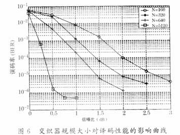 基于以上讨论,我们选择S随机交织方式,在译码迭代次数为10的译码条件下,选择迭代结构,对交织规模N不同情况下的误码性能进行了仿真,结果如图6所示,分别给出了交织规模N为160、320、640、5120时,误码率随信噪比的变化而变化的曲线。显然,在信噪比较低,SISO模块迭代次数均为10的情况下,交织单元的规模越大,其交织的一致性越好,如图6所示,当N=5120时,误码率在信噪比略有增大时就有剧烈的衰减,表现出了良好的提高译码性能的能力。