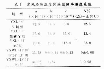 这就是石英晶体的温度敏感特性,式中,f0为在任意参考温度t0℃时的频率;a、b、c分别为一、二、三阶频率温度系数,与晶片的切割类型及振型有关。作为温度传感器,为了保证较高的灵敏度以及温度-频率特性有良好的线性,a值要大,且远大于b和c的值(最好有b=c=0),但实际生产的晶片中二者不可兼得。目前,对于旋转Y切型YXL+5°,有a=95.6×10-6/℃(f=10MHz),分辨率达万分之几度;Ys切型:a=80×10-6/℃(f=5MHz,n=3),分辨率高达4×10-6℃;NL切型线性度很好,其系数a=63.5×10-6/℃,b=-18.1×10-9/℃,c=-35.9×10-11/℃。常见石英温度传感器的主要切型、各阶温度系数及温度-频率非线性度如表1所示〔3〕。