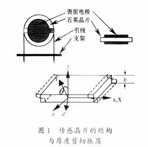 压电石英晶体在振荡电路激励下,会产生各种形式的机械振动。晶片的厚度剪切振荡〔2〕如图1所示,其振荡频率为:
