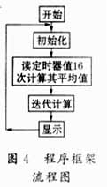 编写程序的框架流程图如图4所示,为消除偶然误差,定时器的n值取其连续16次测量值的平均值(除以16易实现)。迭代计算依据上面的分析,按照式(8)、(9)、(6)、(9)的顺序计算,其中的算术运算通过调用子程序来完成,其余不再赘述。