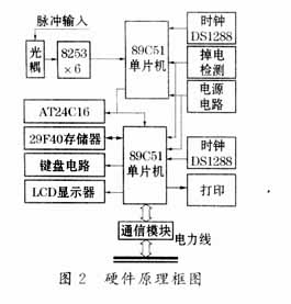 51单片机,实现多路脉冲信号的采集,电能表发出的脉冲信号经过脉冲整形电路和滤波电路后,输入到6片8253计数器中,8253带有3个独立的减法计数器,在工作方式0的控制下,能对外部事件计数。从CPU每隔5min,轮流读取计数器中脉冲电能的个数,以获得每分钟的电能脉冲个数的平均值,并存入数据存储器AT24C16中。该存储器与89C51之间用
