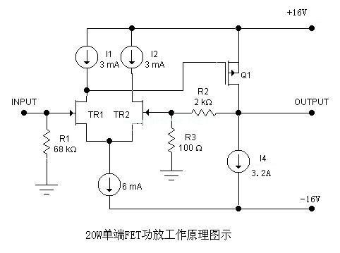 由TR1、TR2组成的差分电路,为了工作稳定,提高电路的共模抑制比,使用了恒流源电路。输出的信号由Q3组成的单端放大输出级,由恒流源I4作为Q3的直流负载。R1决定了放大器的输入阻抗,R2、R3是负反馈回路,决定了放大器的闭环增益。