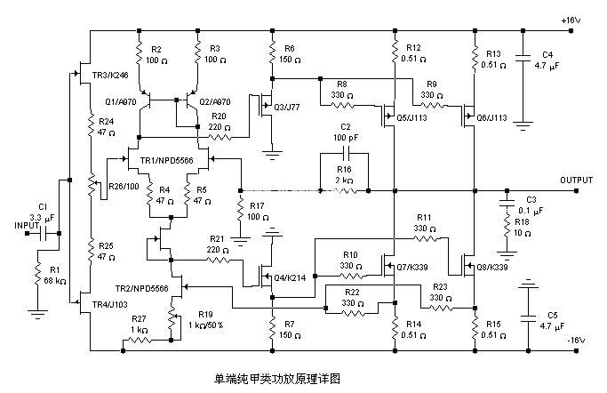 下面,就介绍一种工作稳定,调试简便的单端纯甲类功放电路,负载可以使用4-8欧姆,输出功率可以根据自己的需要设定在20W-50W。