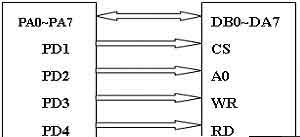 本例利用ATmega128丰富的管脚资源直接通过输入输出引脚控制SED1335。其中数据部分是8条数据线(DB0~DB8),控制部分包括RD(读)、WR(写)、CS(片选)、A0(数据类型选择)。ATmega128与SED1335的接线原理图如图2所示。