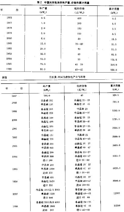 电站,平均每座规模为10kW,到2000年建成的总装机容量为2。 5MW;在2001-2020年期间,除继续在居住相对集中的无电地区建设光伏电站外,还可发展城市小规模井网或独立运行的光伏电站,平均每年建设50座,平均每座规模为30kw,到2020年建成的总装机容量为30MW,③到2000年末,建设2座容量500kW井网运行的大型光伏电站;在2001一2020年期间,建成5座容量各IMW井网运行的大型光伏电站,为电网提供补充电力。同时提出了为实现这一设想在研究开发、产业建设、政策措施等方面的建议。