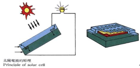 除了太阳热发电技术外,目前人类社会也在大力开发太阳光技术。太阳辐射的光子带有能量,当光子照射半导体材料时,光能便转换为电能,这个现象叫“光生伏打效应”。太阳电池就是利用光生伏打效应制成的一种光电器件。太阳电池与普通的化学电池(干电池、蓄电池)完全不同,是一种物理性质电源。虽然太阳光一照射太阳电池就能发电,但它与一般的发电机大相径庭,它无旋转和磨损,能静悄悄地发电。