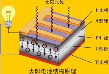 当太阳光照射到半导体上时,其中一部分被表面反射掉,其余部分被半导体吸收或透过。被吸收的光,当然有一些变成热,另一些光子则同组成半导体的原子价电子碰撞,于是产生电子—空穴对。这样,光能就以产生电子—空穴对的形式转变为电能、如果半导体内存在P—n结,则在P型和n型交界面两边形成势垒电场,能将电子驱向n区,空穴驱向P区,从而使得n区有过剩的电子,P区有过剩的空穴,在P—n结附近形成与势垒电场方向相反光的生电场。光生电场的一部分除抵销势垒电场外,还使P型层带正电,n型层带负电,在n区与p区之间的薄层产生所谓光生伏打电动势。若分别在P型层和n型层焊上金属引线,接通负载,则外电路便有电流通过。如此形成的一个个电池元件,把它们串联、并联起来,就能产生一定的电压和电流,输出功率。