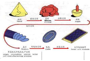 2、晶体硅太阳电池的制作过程: "硅"是我们这个星球上储藏最丰富的材料之一。自从上个世纪科学家们发现了晶体硅的半导体特性后,它几乎改变了一切,甚至人类的思维,20世纪末,我们的生活中处处可见"硅"的身影和作用,晶体硅太阳电池是近15年来形成产业化最快的。生产过程大致可分为五个步骤:a)提纯过程 b)拉棒过程 c)切片过程 d)制电池过程 e)封装过程. 如下图所示: