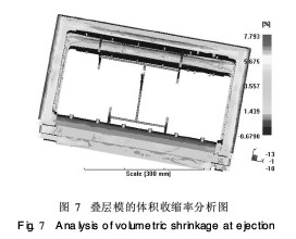 体积收缩率分析可以预测制品收缩信息,避免由于收缩不均而产生内应力、翘曲等问题。从图7可看出,各处体积收缩相对均匀,收缩率基本在4.6%左右,接近设计制品时考虑的收缩率(5% )。