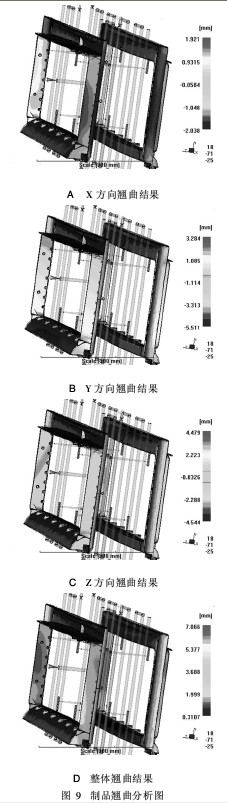 由图9可看出,制品在X、Y方向的翘曲较严重。经分析,这主要是由于冷却管道出入口温度差异引起的。如果要得到比较准确的成型尺寸,就要重新设计冷却管道的布局,减少管道出入口温度差异。简单的方法是减少管道长度,增加进出口个数。空调面板框在使用时镶嵌在箱体上,小翘曲对使用影响不大,此分析结果基本上可以满足需要。