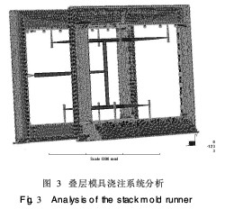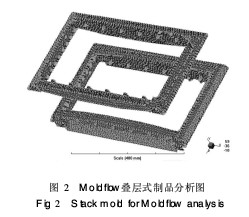 经过转化的三维模型,导入Moldflow分析软件,并按要求输入纵向长度和横向长度自动划分网格,得到初步网格图形。本分析由于是叠层式模具分析,故要对已经划分的实体进行处理,使其叠层,如图2所示。
