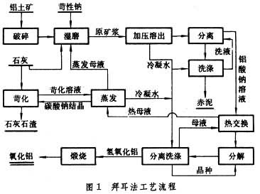 拜耳法的优点主要是流程简单、投资省和能耗较低,最低者每吨氧化铝的能耗仅3×106千卡左右,碱耗一般为100公斤左右(以Na2CO3计)。