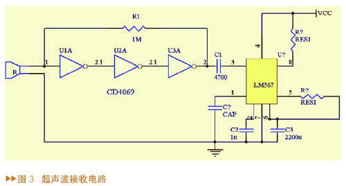 超声波接收电路如图3所示。接收头采用与发射头配对的超声波接收器R,将超声波调制脉冲变为交变电压信号。为了进行信号的整形,在设计中的CMOS电平的6非门芯片CD4069,可以减少电路的复杂程度,提高电路的带负载能力。整形后的信号由C1耦合给带有锁定环的音频译码集成块LM567的输入端3脚,当输入信号的幅度落在其中心频率上时,LM567的逻辑输出端8脚由高电平跃变为低电平。