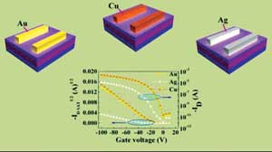 此前,研究人员发展了铜和银修饰方法来代替金作为有机场效应的源漏电极并得到了高性能器件,之后通过纳米结构电极的构筑,研究了电极形貌与器件性能的关系。近期,该实验室在低成本高性能有机场效应晶体管的研究方面又取得新进展,他们利用低功函数的铜为源漏电极制备了高性能的上电极结构的有机场效应晶体管。