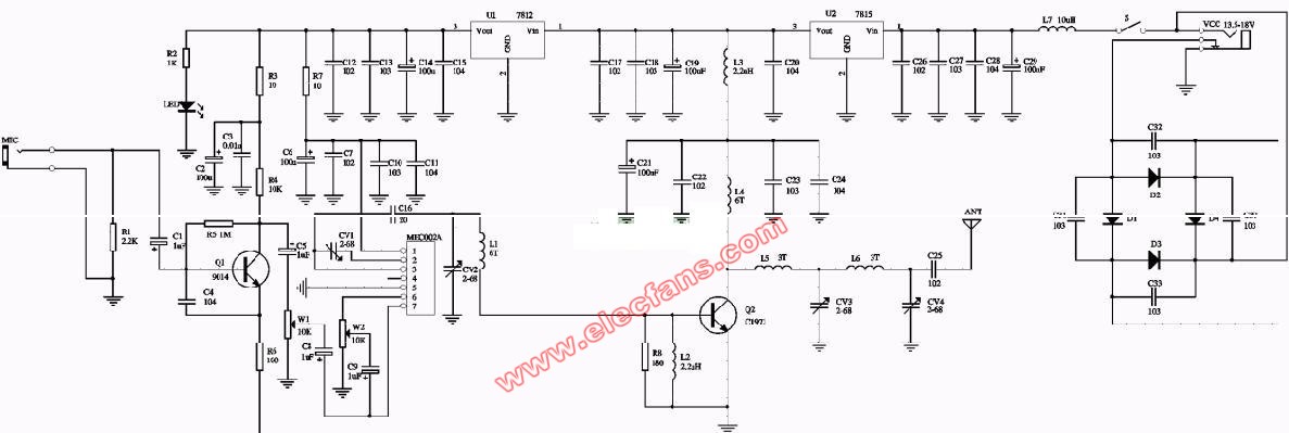 MEC002A的第3脚为其射频输出脚,经调制后的调频波由该脚输出经C16,CV2,L1组成的选频网络后送至由Q2(C1971)构成的丙类放大器的基极,MEC002A的1脚为电源供应端,5脚为电源地。Q2工作在丙类状态,偏置电阻为其基极提供负偏压,可使该电路的输出效率比甲类更高些,其前提条件是前级必需要有足够的激励功率,对12V工作电压下的MEC002A来说,其输出功率已近200mW,完全可以推动该丙类放大电路。U1为C1971提供稳定的15V工作电压,L5,L6,CV3,CV4构成选频网络,通过调节CV3,CV4可使Q2的输出功率有效地传送给发射天线,整机在18V工作电压下工作电流约为800mA,射频输出功率约3W。本电路还提供了市电供电功能,D1-D4组成全桥整流电路,C30-C33为滤波电容,可减少市电带来的交流纹波。输入交流电压控制在18V左右。整机工作直流电压为18V,当使用13.5-18V电压时U2可免去不用,直接用跳线短接其1,3脚焊盘。