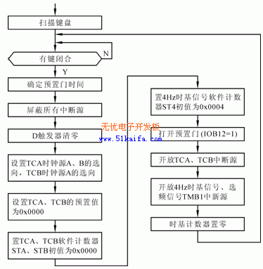 主程序主要完成预置门时间的选择及测频系统各部件的初始化设置。主程序流程如图3所示,通过IOA口扫描键盘,以确定欲设置的预置门时间。对各部件初始化设置如下:D触发器FD的初始化;使IOB11端输出负脉冲,Q端置0;定时/计数器TCA、TCB的初始化;通过编程定时器控制字,使TCA的时钟源A选择频标信号fS=fOSC/2=24.576MHz,时钟源B选择外部时钟EXT2。TCB的时钟源A选择外部时钟EXT1,TCA、TCB的预置值均为0x0000。由于本测频系统最大预置门时间为10s,在10s内,TCA对频标信号的计数值为NS=10s×fS=24.576×107,而TCA的最大计数值为216=65536,因此,需要一软件计数器STA,又因10s内TCA的溢出次数为24.576×107/216=3750,因此只需要一个存贮单元的软件计数器。类似TCB在10S内对被测频率fX的计数也需要一个存贮单元软件计数器STB。置STA(0x0010)、STB(0x0011)的初值为0x0000。与时基计数器有关的初始化:本测频方案使用4Hz时基信号中断源实现预置门时间的设置。4Hz时基信号开始工作时需要时基计数器清零,同时,计录4Hz时基信号的中断次数需要一个存贮单元的软件计数器ST4,当预置门时间为1s时,ST4(0x0012)的初值为0x0004。