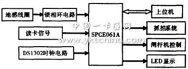 控制器设计框图如图2所示,系统选用SPCE061A型单片机作为主控芯片,单片机通过读卡信号和锁相环电路的电平变化检测车辆的到来。DS1302时钟电路为系统提供精确的时间信息,通过驱动LED显示牌实时显示车位及时间信息,系统具备与上位机的串行通信通信接口。
