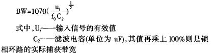 LM567的第5、6脚外接的电阻、电容决定了IC内部压控振荡器的中心频率,fo=1/1.1RC。第1、2脚通常图4锁相环电路 是分别对地接电容,形成输出滤波网络和环路低通滤波网络,其中第2脚所接电容决定锁相环电路的捕捉带宽,带宽的理论值可用此公式计算: