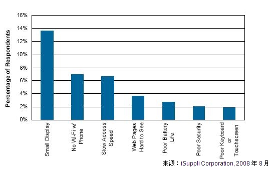除了服务成本太高和偏好电脑上网以外,消费者还指出一些技术因素也在阻碍其利用手机上网。令人意外的是,消费者表示3G网络的上网速度没有屏幕尺寸重要。iSuppli公司的调查结果显示,尽管运营商因为可能损失ARPU而不太喜欢Wi-Fi,但用户对Wi-Fi连接的喜爱程度超过3G连接。