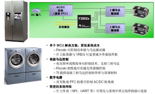 TI方面称,Piccolo F2802x/F2803x控制器可取代多个电子组件,从而在实现电子产品管理的同时还可降低系统整体成本。例如,在变频空调设备中,一个 F2802x/F2803x控制器就可精确控制两部电气三相马达,并可执行功率因数校正(PFC)计算,并具备掉电保护与上电复位功能。目前,包括欧洲、中国、日本以及印度在内的全球约30%的市场都需要PFC功能,而且欧洲还针对大型家电制定了严格的IEC 60730安全标准。