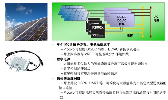 此外,Piccolo MCU还可为太阳能电池板提供更高的工作效率以及控制功能。标准太阳能系统在多个太阳能电池板上使用一个逆变器,但初步研究显示,连接至系统内每个太阳能电池板的单个微型逆变器将有助于提高功率转换效率。系统宽逆变器可将作为完整系统的电池板的平均输出最大化,与之不同的是,微型逆变器能够最大限度地提高每个单电池板的输出。