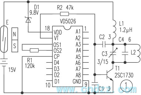 电阻R1决定,R1阻值越小,振荡频率越高。R1的阻值可在120kΩ~470kΩ之间选择,但应注意R1的阻值必须和报警接收部分的解码器VD5027的振荡电阻R15(见图2)的阻值严格一致,否则无法可靠解码。