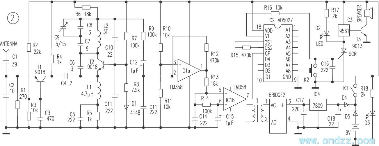 控制器 图2是无线接收报警控制器的电路原理图,它由超再生接收、放大、整形、译码电路及报警