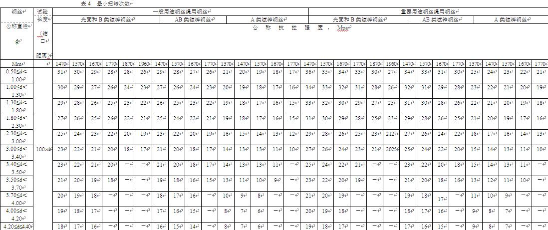 直径不小于0.50mm的钢丝,应进行扭转试验,钢丝应达到表4规定的最小扭转次数。 | ||||||||||||