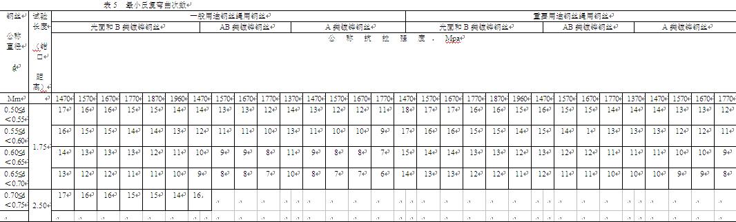 直径不小于0.50mm的钢丝,应进行反复弯曲试验。钢丝应达到表5规定的最小反复弯曲次数。 | ||||||||||||