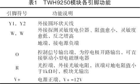 环状天线发射的微波信号形成一个立体微波警戒网,当有人在网内走动时,就会产生人体移动反射回来的微波信号,这时"微波产生"电路便产生出随物体移动的微弱低频信号。该信号经两级放大至70dB左右,再依次送入窗口电压比较电路和脉冲宽度比较电路进行双重鉴别。当确认信号电压的幅值和宽度均达到设定要求时,锁存电路触发,其触发信号经光控门送至计数控制电路进行输出延迟处理,延迟时间设定为10s,最后由末级功率管的集电极输出。为提高微波电路的稳定性能,比较电路的精度,各部分电路由4V和7V稳压系统单独供电。该电路在初次通电时,需经40s预稳定时间才能进入探测戒备状态,以后只要不掉电,电路随时处于探测状态。TWH9250模块正常工作电压为12 V。各引出脚功能如表1 所示。