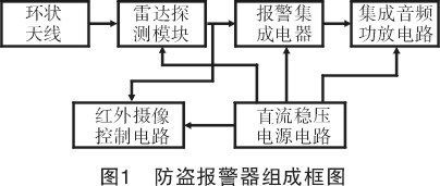 考虑该防盗报警器在探测到警情时应具有声光报警功能,同时还需对现场进行摄像控制,所以,在电路结构的设计上除用于发射微波的环状天线之外,还应包含雷达探测模块、报警集成电路、集成音频功率放大电路、红外摄像控制电路和直流稳压电源电路5个部分,其组成框图如图1所示。