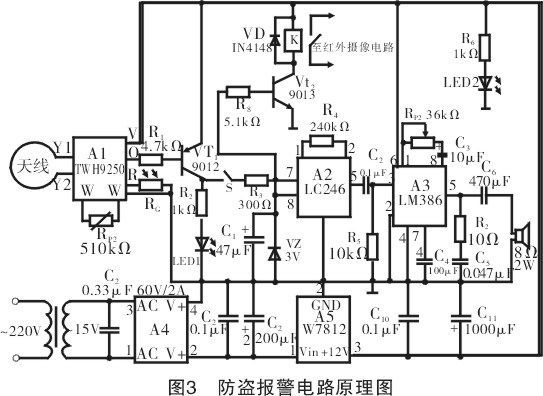 为了使防盗报警器发出类似消防车的声音,A2采用LC246报警集成电路[1],并将他的第一选声端即8脚接电源(3V),读者如果改变其选声端的电平,则可获得其他的报警声响。
