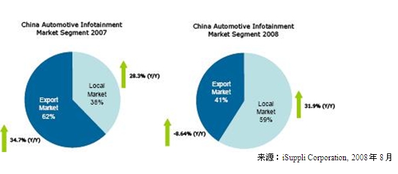 这些因素最终导致中国信息娱乐产业出口急剧下降,而2007年出口占信息娱乐产品总体销售额的65%。iSuppli公司预测,2008年上半年出口市场仅占整体行业产量的三分之一。