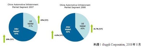 2008年,配件市场占中国汽车信息娱乐营业收入的份额将下降到60.3%,比2007年下降6.8%。同时,2008年OE市场营业收入预计稳步增长,占整体市场的份额将从2007年的36.7%上升到39.7%。